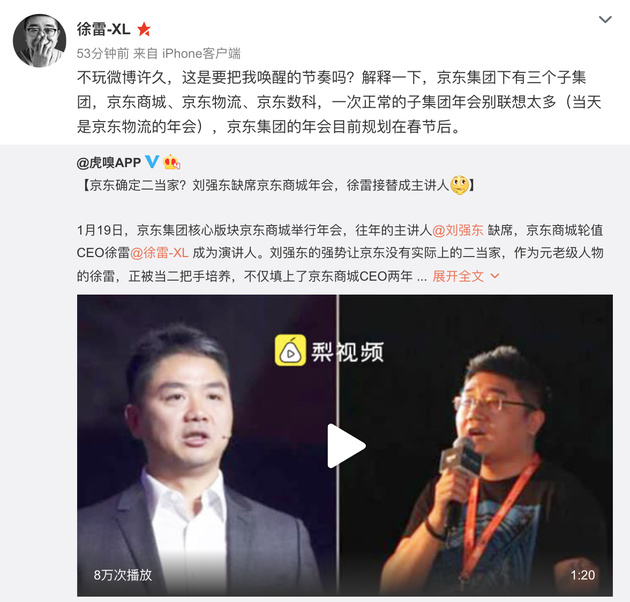 针对有消息称京东商城轮值CEO徐雷成为京东商城年会主讲人、“二当家”,徐雷在微博上回应称,京东集团下有三个子集团,京东商城、京东物流、京东数科,一次正常的子集团年会别联想太多(当天是京东物流的年会),京东集团的年会目前规划在春节后。