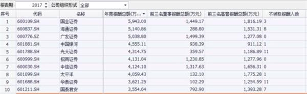 根据东方财富Choice金融终端数据统计,截至4月10日,共有21家上市券商发布了2017年年报。其中,董监高年度报酬总额前十名排序是这样的: