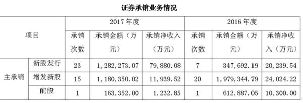 2017年,公司投资银行业务实现营业收入13.56亿元,较上年增长3.88%。其中IPO主承销23次,承销金额128.23亿元,承销净收入7.99亿元;均较2016年出现大幅增长。