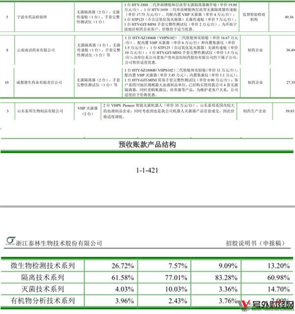 但是,《号外财经》分析其主要产品期末预收账款占比情况发现,2017年1-9月,泰林生物所说的预收款占比较高的隔离技术系列及灭菌技术系列相较于2016年出现小幅下降,但微生物检测技术系列和有机物分析技术系列却明显提高,如下图: