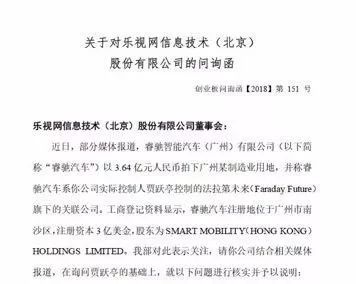 2018年4月9日,深圳证券交易所向乐视网公司发出《问询函》,要求其对“贾跃亭相关公司在广州买地一事”进行说明,并对资金来源进行了质问。