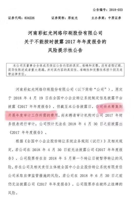 日前,新三板公司彩虹光公告称,原定于2018年4月19日在全国中小企业转让系统制定信息披露平台披露《2017年年度报告》,但截至本公告披露日,公司尚未筹集到开展年度审计工作所需的费用,尚未聘请审计机构对公司2017年财务报表进行审计,公司预计无法在2018年4月30日之前披露