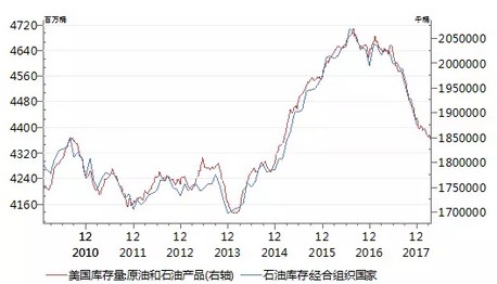 尽管OPEC主席马兹鲁伊不认可此说法,但也不能否认2016年末OPEC与俄罗斯达成联合减产协议(每日减产约180万桶原油)达到了预期效果,供给减少使得原油市场恢复供需平衡,原油库存也逐渐回落到2015年初的水平(参见下图),国际油价也正是从2016年开始止跌回升。