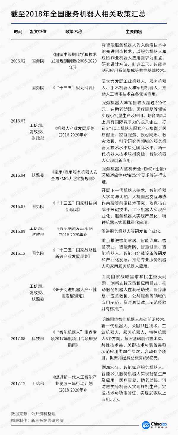 2006年2月,国务院发布《国家中长期科学和技术发展规划纲要(2006-2020年)》,首次将智能服务机器人列入先进制造技术中的前沿技术。《纲要》提出智能服务机器人是在非结构环境下为人类提供必要服务的多种高技术集成的智能化装备。未来将以服务机器人和危险作业机器人应用需求为重点,研究设计方法、制造工艺、智能控制和应用系统集成等共性基础技术。
