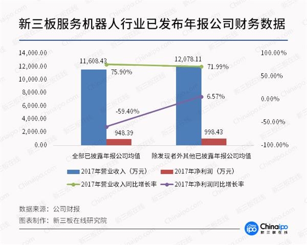 虽然净利润同比增长率均值为负,但事实上在25家已披露年报的公司中只有6家2017年净利润同比下降,占比为24.00%,而主要的净利润下降情况都集中在发现者一家公司上,在排除发现者的特殊情况之后,整个新三板服务机器人行业的年报表现均有了不同程度的变化,平均净利润同比增长率也大幅上升至6.57%。