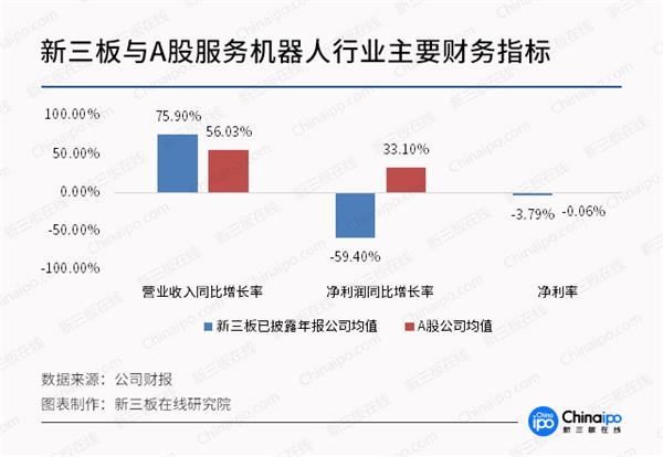 同一时期,新三板机器人行业平均净利润同比增长率为35.11%,A股机器人行业的平均净利润同比增长率则高达91.28%,无论是新三板市场还是A股市场,整个机器人行业的发展情况都要比服务机器人行业好不少。