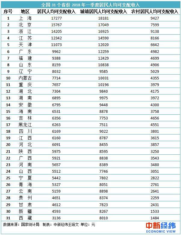 一季度收入排行榜:5省份人均可支配收入过万