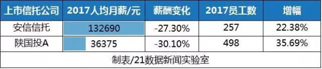 相对2016年,两家公司人均月薪下滑幅度都在30%左右。不过安信信托人均月薪仍有13万。