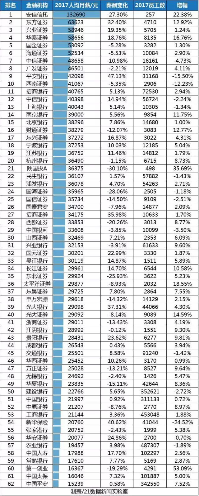 注:本文只计算A股上市的62家券商、银行、保险、信托公司,数据来自于上市公司2017年报。由于各公司有编制在外的员工,薪酬数据仅供参考,不一定代表真实情况。