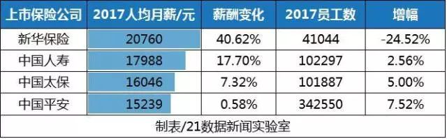 从数据来看,2017年,新华保险、中国人寿、中国太保、中国平安的人均薪酬均有所上升,尤其新华保险更是增长40.62%。