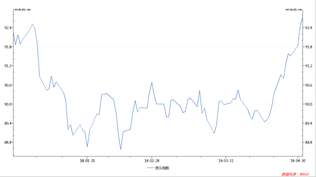 4月17日以来,美元指数拔地而起, 12个交易日里10涨2跌,急涨3.7%,实现向上突破。