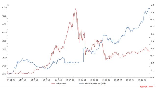 比如,2014年1至4月,人民币兑美元贬值时期,A股基本横向整理;2014年11月至2015年2月贬值时期,A股则处于一轮升势中;2015年8·11汇改后,人民币兑美元急贬,A股掀起一轮跌势;2016年全年人民币兑美元大幅贬值,A股缓步上涨。