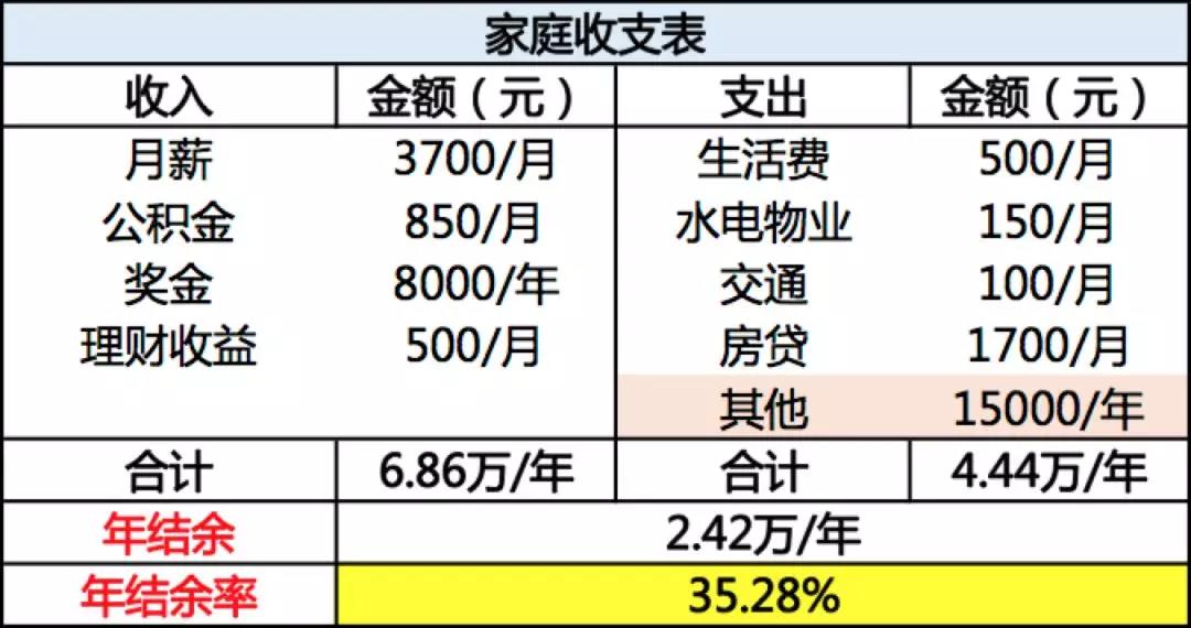 从收支表的数据看,依依的总体年结余率为35.28%,大于30%的结余率标准,是比较健康的。从月支出情况看,月供占了整个月支出的近7成,可见依依平时的生活开销并不大。