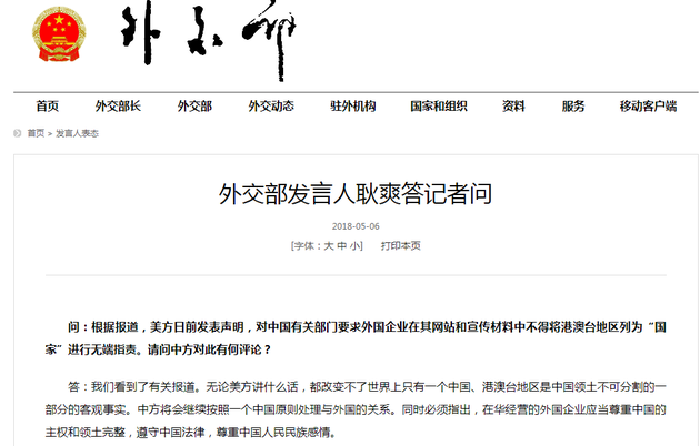 针对美国无端指责中国有关部门要求外国企业在其网站和宣传材料中不得将港澳台地区列为“国家”一事,中国外交部发言人耿爽今天表示,无论美方讲什么话,都改变不了世界上只有一个中国、港澳台地区是中国领土不可分割的一部分的客观事实。中方将会继续按照一个中国原则处理与外国的关系,在华经营的外国企业应当尊重中国的主权和领土完整,遵守中国法律,尊重中国人民民族感情。