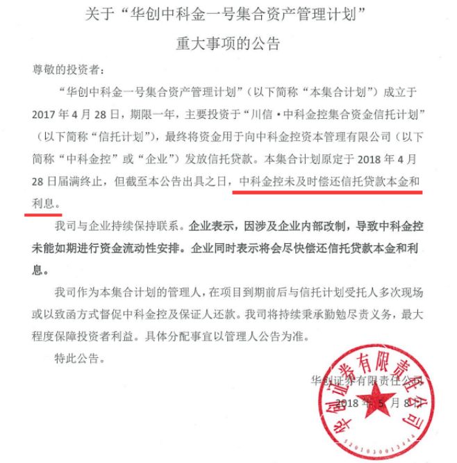 券商中国记者从华创证券官网获悉,华创证券最新发布一则《关于“华创中科金一号集合资产管理计划”重大事项的公告》,按照合同约定,由华创证券管理的“华创中科金一号集合资产管理计划”产品本应于今年4月28日届满终止,主要投资于“川信?中科金控集合资金信托计划”。但截至今日,由于资金最终投向方——中科金控资本管理有限公司(下称“中科金控”)未及时偿还信托贷款本金和利息,触发违约。