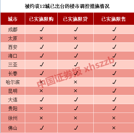 住建部近日就房地产市场调控问题相继约谈了12个城市,分别为:西安、海口、三亚、长春、哈尔滨、昆明、大连、贵阳、徐州、佛山、成都、太原。