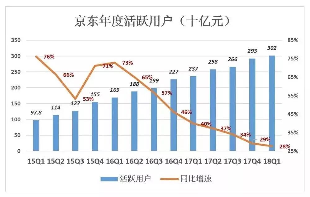 京东截至2018年3月31日的年度活跃用户数较一年前增长28%,而2018年Q1营收增长了31%,比活跃用户增速略高。