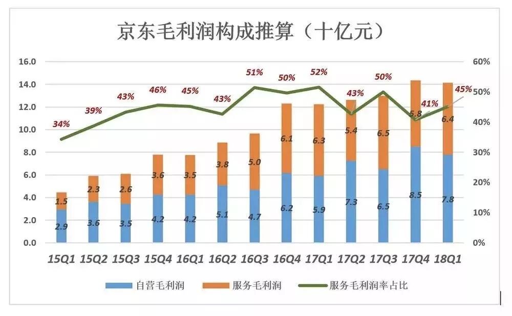 服务收入占比低于10%,但从2015年下半年开始,对毛利润的贡献率达40%~50%,京东整体毛利润率被显抬高,2018年Q1毛利润率达14.1%。