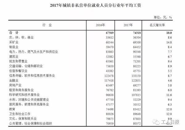 2017年,全国城镇非私营单位就业人员年平均工资为74318元,比上年增长10.0%,增速比上年加快1.1个百分点,扣除物价因素,实际增长8.2%。