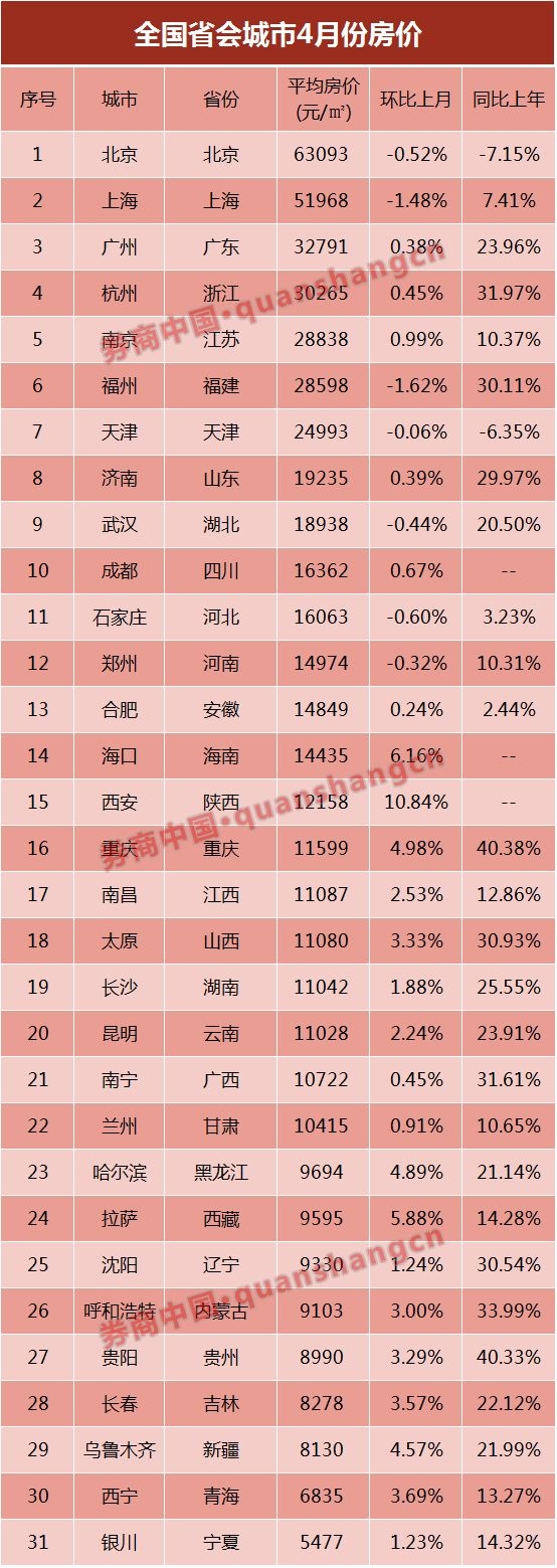 省会城市中,杭州均价超过3万元/平,南京、福州、天津超过2万元/平;此外,重庆和贵阳均价和去年同比涨幅均超过40%,重庆11599元/平,同比上涨40.38%;贵阳8990元/平,同比上涨40.33%。