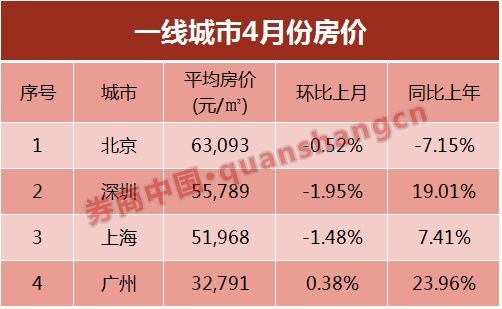 中国房价行情平台最新的数据显示,北上广深最新的平均房价依次为:北京63093元/平,环比下跌0.52%;深圳55789元/平,环比下跌1.95%;上海51968元/平,环比下跌1.48%;广州32791元/平,环比上涨0.38%。