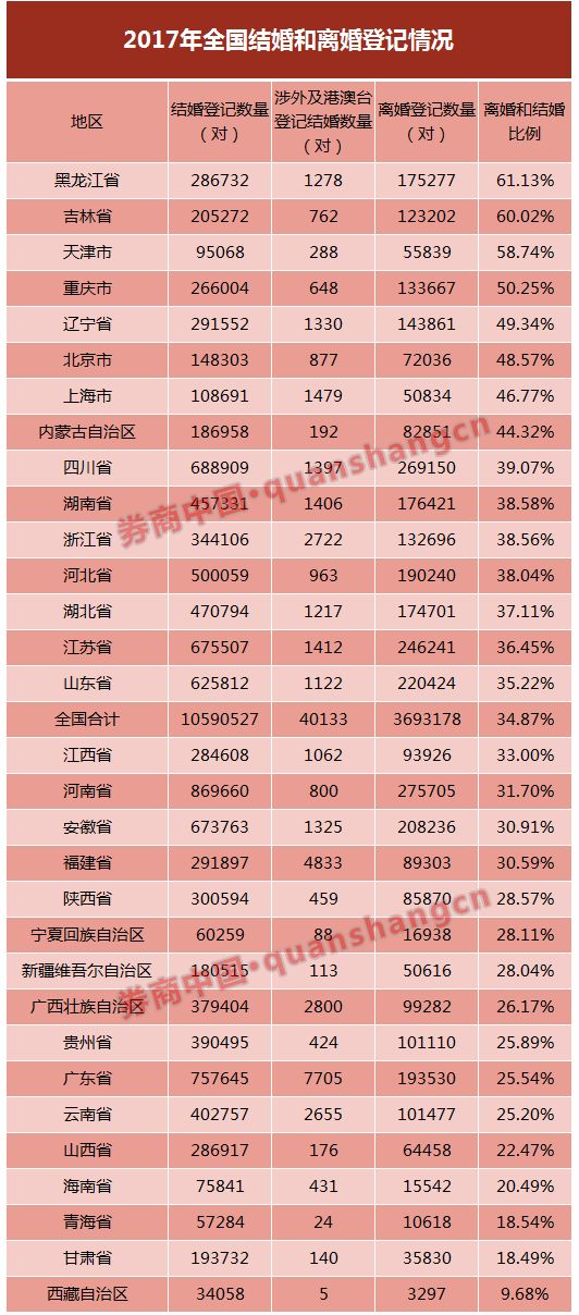 券商中国记者从民政部网站获取的数据显示,截至去年底,全国共计结婚登记10590527对,离婚登记3693178对。从全国省份排名来看,离结比排名居前的是黑龙江(61.13%);吉林(60.02%);天津(58.74%),北京和上海仅排在第六七位。