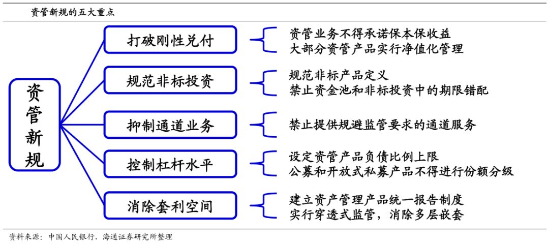 为了实现上面的目标,资管新规主要从5个方面对资管行业进行了约束,包括打破刚性兑付、规范非标投资、抑制通道业务、控制杠杆水平和消除套利空间。