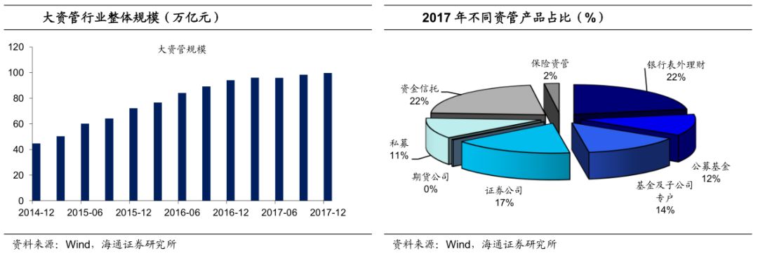 2017年大资管整体业务规模近100万亿。在资管行业发展初期,资管产品主要是信托的通道业务、公募基金和银行理财。而2012年以来,银行理财产品规模不断扩大,带动资管产品需求增长;同时,资管业务监管的逐步放松使得行业进入门槛大幅降低,各类金融机构都相继开展资管业务。自此,我国的大资管时代到来,资管行业业务规模也逐年递增,2017年更是接近100万亿。