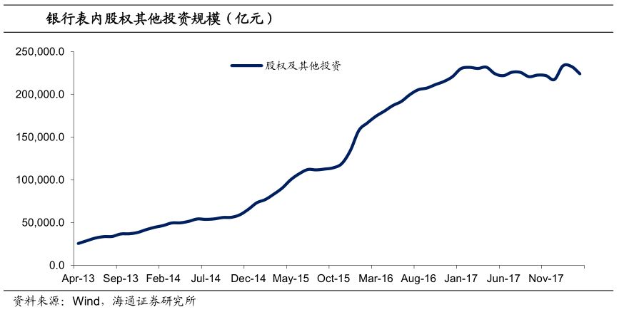 无论是理财资金转移还是产品转型,未来银行投资到其他资管产品的资金都将减少。根据2016 年底证券投资基金业协会的统计,券商资管定向计划中有86.4%的资金来自于银行和信托,基金公司专户资金有58.1%来自银行,基金子公司专户资金有63.1%来自银行的委托。银行投资资管产品的资金主要来自表内的股权及其他投资和表外理财,受到前期金融监管的影响,银行对于资管产品的投资已经放缓,而随着资管新规的出台,通道业务的限制和整体理财规模的收缩将对资管产品的需求造成进一步冲击。