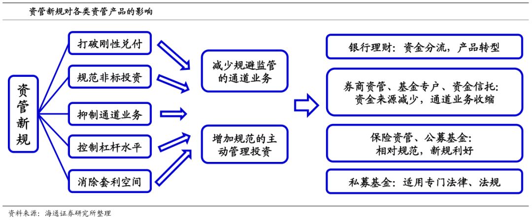 整体来看,本轮资管新规的主要目的:一是打破刚兑、二是抑制通道业务、三是规范主动管理业务。