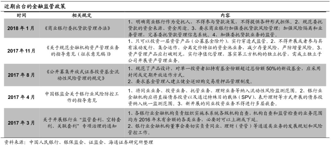 资管过度繁荣,监管防控风险。总规模近百万亿,体量都不小。2012年以来,伴随着银行理财规模的扩大和监管政策的放松,资管行业业务规模逐年递增,2017年更是接近100万亿。从产品分布来看,2017年银行表外理财规模最大,而信托、公募基金、基金专户、私募基金和券商资管规模也均超过10万亿。创新增风险,监管来约束。资管行业快速发展的过程中,业务的不断创新也导致多层嵌套、期限错配、杠杆率飙升、刚性兑付等问题。在这样的背景下,资管新规的出台从5个方面对资管行业进行了约束,包括打破刚性兑付、规范非标投资、抑制通道业务、控制杠杆水平和消除套利空间。