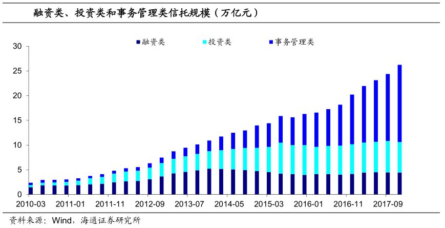 尽管,2012年以后券商和基金先后开展资管业务打破了原来信托一家独大的局面,但是借着金融自由化的东风,整个资管行业不断扩张,信托产品规模也从2012年初的5.3万亿持续增长到2017年的26.2万亿,其中资金信托规模达到近22万亿。