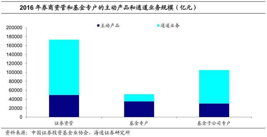 具体来说,根据证券投资基金业协会的统计,截止2016 年底通道业务在券商资管、基金子公司和基金专户的规模分别达到12.38万亿、7.47万亿、1.60万亿,其中前两个机构中通道业务占比均超过70%。在银行投资需求大幅下降和主要业务受限的情况下,券商资管和基金子公司专户规模也将出现明显下降。