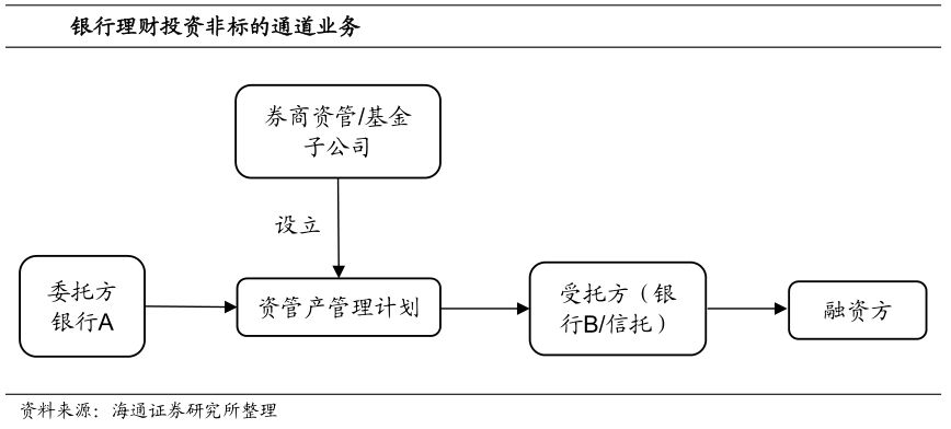 以银行A利用资管产品作为通道投资非标资产为例:银行想要给贷款受限的企业贷款,可以发行表外理财产品获取资金,然后通过券商或者基金公司发行的资管产品投资信托B的信托计划,然后信托B再将贷款定向发放给该企业。通过如此操作,实际出资人银行A通过两层通道业务将资金投给了目标企业,摆脱了监管的限制。