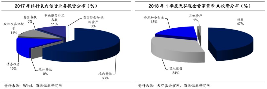 货币基金主要投资的是短期货币市场工具,例如银行大额存单、短期国债、买入返售资产等,而货币基金投资的债券则主要以高信用等级高流动性为主。以天弘基金现金管家货币基金为例,其投资债券占比47%、买入返售资产占比34%、银行存款和备付金占比18%。此外,货基和类货基产品未来如果采取净值化管理,将会增加低风险资产例如存款和国债配比。因此,银行理财资金转移到货币基金或者类货基固收产品之后,将会增加货币市场工具和高信用等级债券的配置。