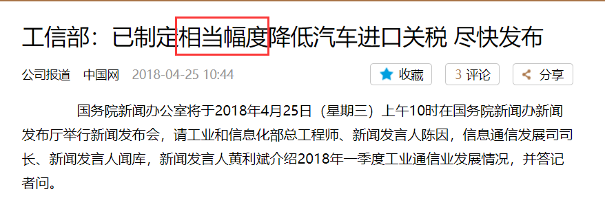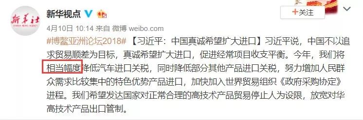 每日经济新闻(微信号:nbdnews)记者注意到,所谓“相当幅度”降低进口车关税,其实此前就已有征兆。4月10日,博鳌亚洲论坛传来消息,2018年将相当幅度降低汽车进口关税。