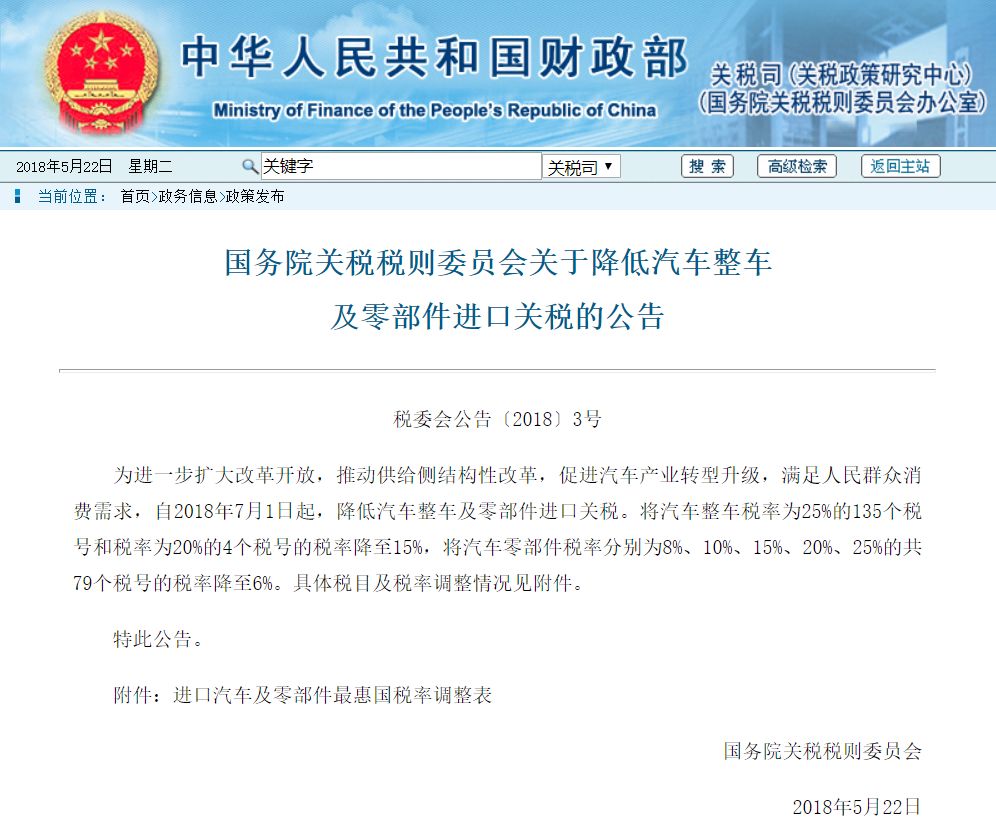 5月22日下午,国务院关税税则委员会发公告称,自2018年7月1日起,降低汽车整车及零部件进口关税。将汽车整车税率为25%的135个税号和税率为20%的4个税号的税率降至15%,将汽车零部件税率分别为8%、10%、15%、20%、25%的共79个税号的税率降至6%。