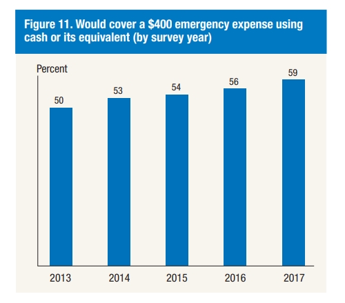 虽然美国家庭的整体财务状况有所改善,但报告显示,如果不靠借或其他方式,仍有41%的成年人拿不出400美元的应急钱。
