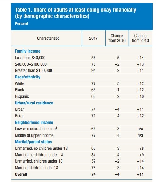 报告显示,整体而言,去年74%的美国家庭的财务状况达到了还不错或舒适的水平,比2013年的首次调查高出10%。