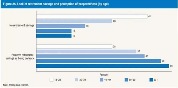 退休储蓄方面,60%的成年工作者认为他们退休后可能会面临经济方面的问题,25%的成年工作者则没有退休储蓄或退休金。
