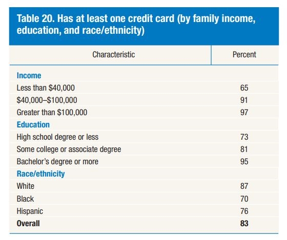 至于信用卡方面,83%的美国成年人至少持有一张信用卡。按收入划分看,年收入在10美元以上的人至少有一张信用卡;而在年收入低于4万美元的人中,只有65%的人有信用卡。