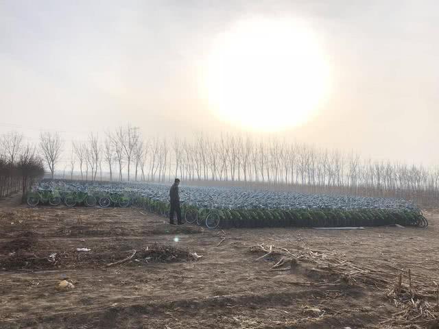 在王庆坨小镇三四公里开外的赵家柳村,AI财经社在一处田野里见到了堆积着上万辆的酷奇单车和小蓝单车。