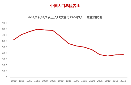 1950年,中国的人口抚养比为60.5%,在鼓励生育的政策影响下,到1965年,中国人口抚养比例到达历史峰值80%,这与知识青年上山下乡之间有没有必然关系呢?1976年,在推行计划生育政策5年之后,抚养比开始明显下降。
