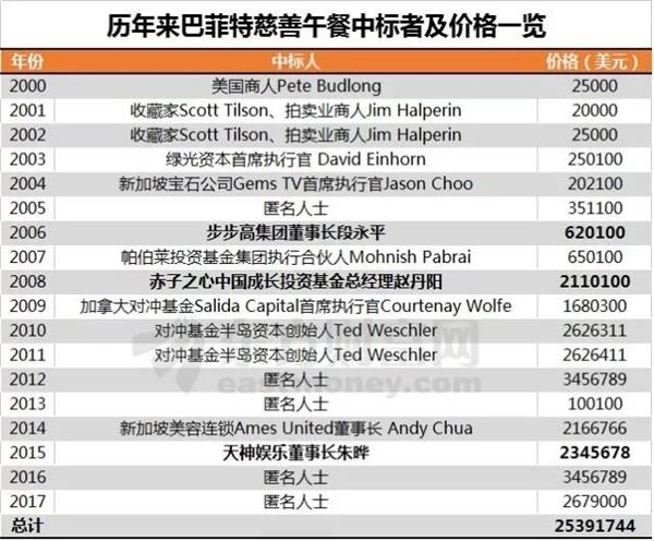 此外,在以往公开身份的中标者中,共有三位华人先后成为巴菲特的座上宾。他们分别是步步高集团董事长段永平、赤子之心中国成长投资基金总经理赵丹阳以及天神娱乐董事长朱晔。这三位的竞拍价格之和达到507.59万美元,占18次竞拍金额总和的近五分之一。