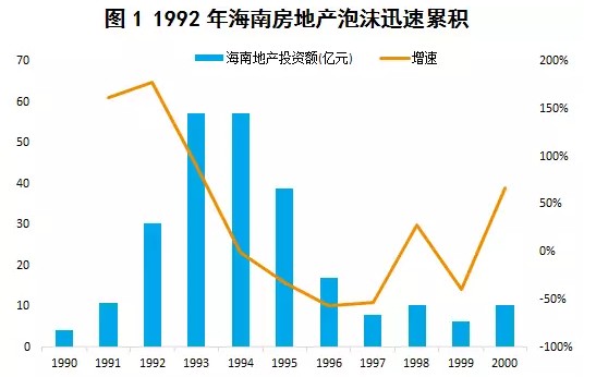 1992年开始,在银行表外信贷支持下,出现一轮海南房地产投资热潮。与当前银行通过同业业务、股权投资和表外理财绕过监管进行信贷投放类似,1992年银行通过开立公司的办法发放贷款,其中大部分资金都流入了房地产领域。以海南为例,在资金推动下,海南房地产投资迅速抬升,1992年和1993年海南的房地产投资增速高达178%和90%(参见图1)。我国房地产市场的第一个泡沫由此登上历史舞台。