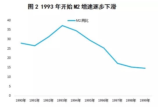 1993年6月开始,政府加强宏观调控,银行表外贷款开始紧缩。全国投资热潮和银行表外乱象引发担忧,1993年6月国务院出台《关于当前经济情况和加强宏观调控意见》,列出严格控制信贷总规模、提高存贷利率、削减基建投资、清理在建项目等一系列措施。其中,信贷控制无疑是最釜底抽薪的政策。当年7月全国金融工作会议召开,时任国务院副总理朱镕基兼任中国人民银行行长,调控措施逐步发挥威力,M2同比增速从1993年的37%逐步下滑到1997年的17%(参见图2)。