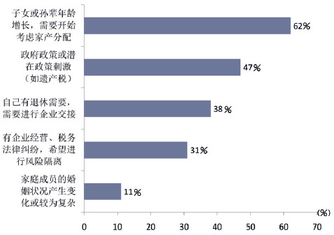 2013 年9 月28 日,征收遗产税被写入十八届三中全会文件草稿引发全社会热议;2017 年1 月1 日起中国已经正式启动与部分国家和地区的金融账户涉税信息自动交换工作(中国版CRS)的相关程序。随后关于遗产税、海外资产缴税的问题持续引发社会关注。2017 年的客户调研中,有近一半的受访者表示政府政策刺激是促进他们考虑财富传承的原因,见图3、图4。尽管目前中国遗产税仍未正式出台,CRS 的落地也仍有很长一段路要走,但遗产税概念的普及、隐私保护等问题正在促使越来越多的高净值家庭开始积极寻求有效的税务规划,以最低成本实现财富的传承。