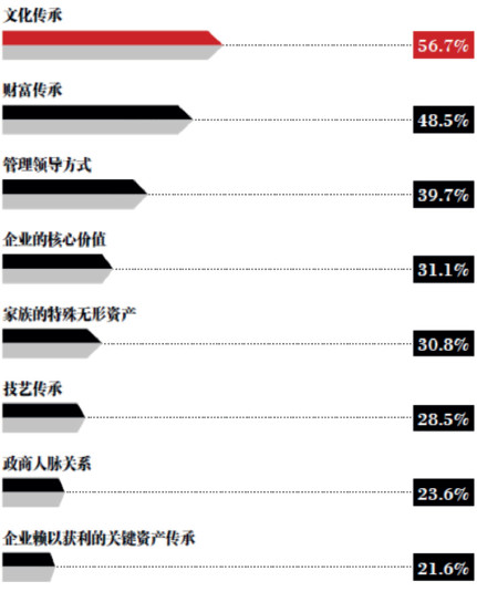 胡润研究院的研究结果也表明,文化传承和财富传承是中国企业家目前最为需要传承的两大内容,占比分别为56.7% 和48.5%。对于企业家来说,文化传承包括创新、勇气、抗压、价值观等深层次的思维观念和生活方式,往往是基业长青和永续的关键性因素。财富传承则是保证资金最大程度地传递完整,为后代的无忧生活奠定基础。与打造百年品牌、企业永续相关的传承是排名第三的需求,包括“管理领导方式”(39.7%)和“核心价值”(31.1%)。