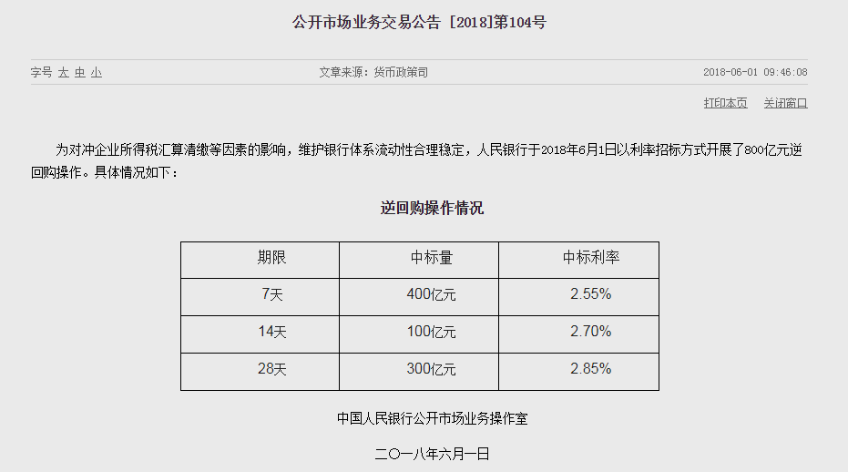 6月1日消息,中国央行今日以利率招标方式开展了800亿元逆回购操作。为对冲企业所得税汇算清缴等因素的影响,维护银行体系流动性合理稳,中国央行进行400亿元7天期逆回购、100亿元14天期、300亿元28天期逆回购,今日无逆回购到期。