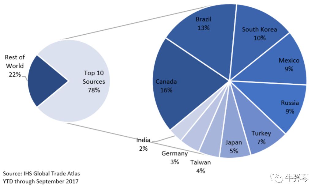 数据显示,截至2017年9月,美国钢铁进口构成中,前十大来源共占到了78%,其中: